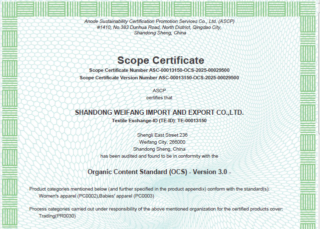 公司自營和代理服裝、食品、五金、化工、機(jī)電等各類商品及技術(shù)的進(jìn)出口業(yè)務(wù),公司有專門的生產(chǎn)、加工基地,并通過了Oeko - Tex Standard 100、GRS、OCS、RCS、USCTP等多項(xiàng)認(rèn)證,可以按客戶要求設(shè)計生產(chǎn),同時承辦中外合資經(jīng)營、合作生產(chǎn)、開展“三來一補(bǔ)”以及技術(shù)輸出、易貨、邊境貿(mào)易等業(yè)務(wù)。公司產(chǎn)品出口到日本、法國、俄羅斯等50多個國家或地區(qū)。